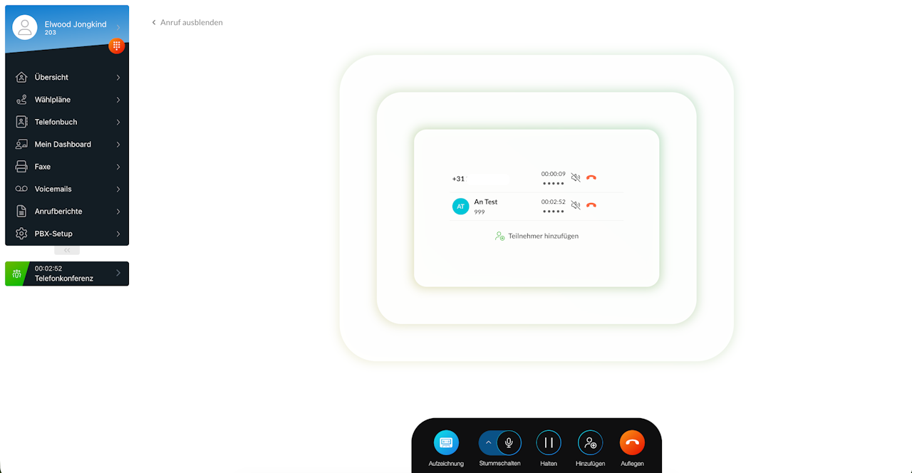 Im Gesprächsbildschirm werden alle Teilnehmer übersichtlich angezeigt, jeweils mit ihrer individuellen Gesprächsdauer.