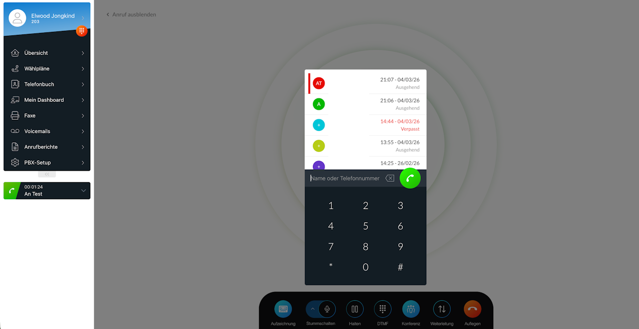 💡 Die Aktionsleiste enthält folgende Schaltflächen: Aufnehmen, Stumm, Halten, Tastenfeld, Konferenz, Weiterleiten und Auflegen.