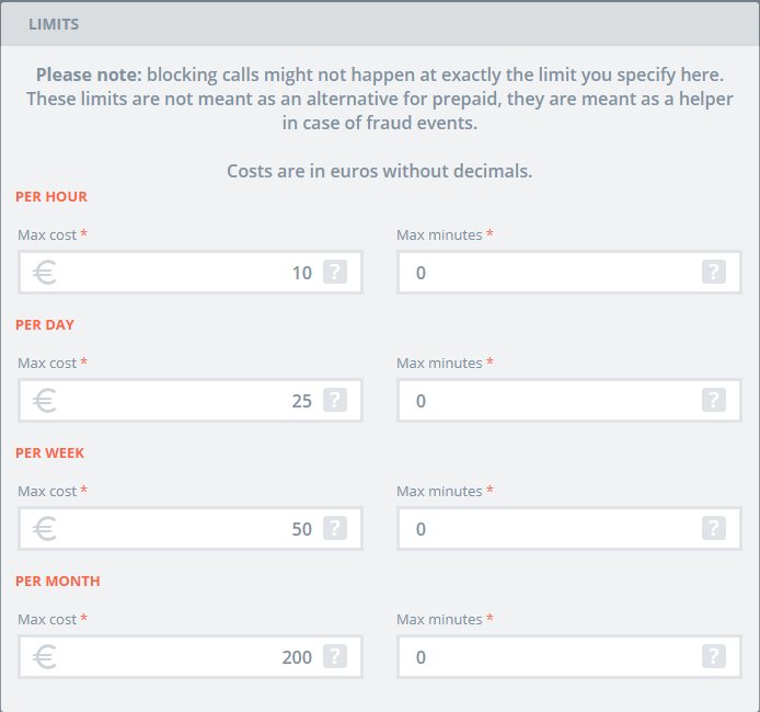 The limits mechanism is a safeguard to minimize unintentional financial loss of the company in case of fraudulent events on their telephony environment. These limits can be set Provider, Reseller and Company in the settings panel of the entity and can be specified in amounts or minutes per hour, day, week and month.